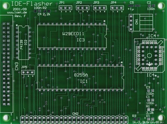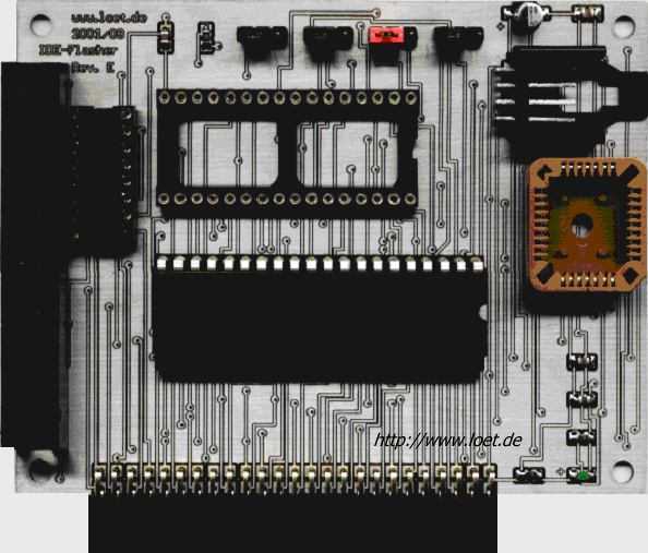 Der hier vorgestellte IDE-Flasher ist die mit Abstand einfachste Realisierung eines FlashROM Schreib- und Lesegerätes und kann auch von weniger erfahrenen Lötkolbenbenutzern innerhalb kurzer Zeit aufgebaut werden (ca. 1-5 h). Es ist kein ISA- oder PCI-Steckplatz erforderlich. Angeschlossen wird die Schaltung einfach an einem freien IDE-Port.